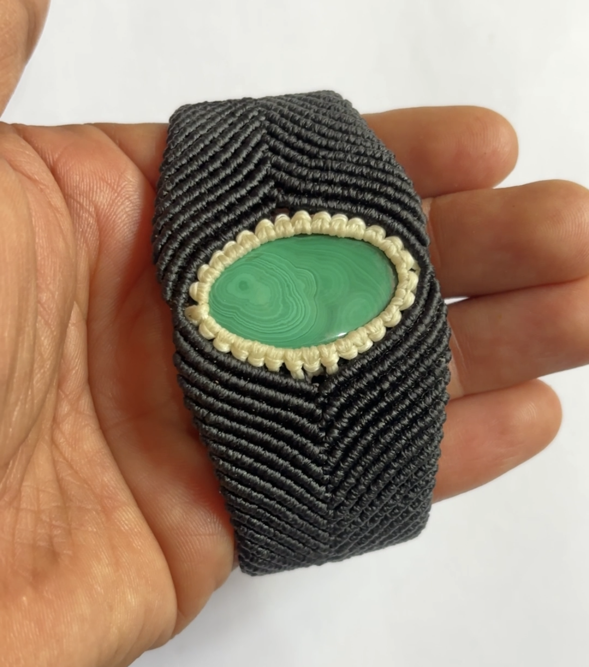 This stunning macrame bracelet features large Malachite stones, known for their vibrant green hues and captivating patterns. Malachite, a stone of transformation, is believed to bring balance and positive energy, making it a perfect choice for jewelry. The bracelet is meticulously crafted using durable macrame techniques, with the large stones acting as a bold centerpiece. The intricate knotting adds a unique, handcrafted touch, making each bracelet one-of-a-kind. Ideal for adding a touch of natural beauty and elegance to any outfit, this Malachite bracelet is perfect for both casual and formal occasions, showcasing the stone’s striking charm.