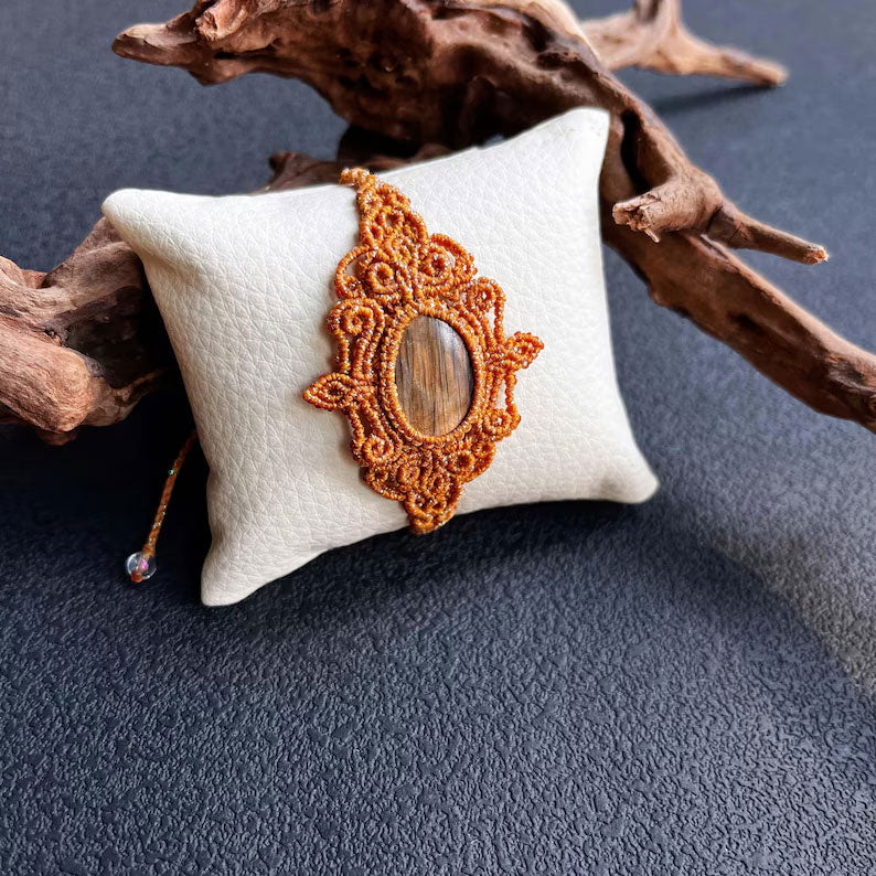Hariom Creations brings you a wide macramé cuff bracelet featuring an earthy wooden-style stone. Hand-knotted durable cord for a rustic, natural aesthetic.