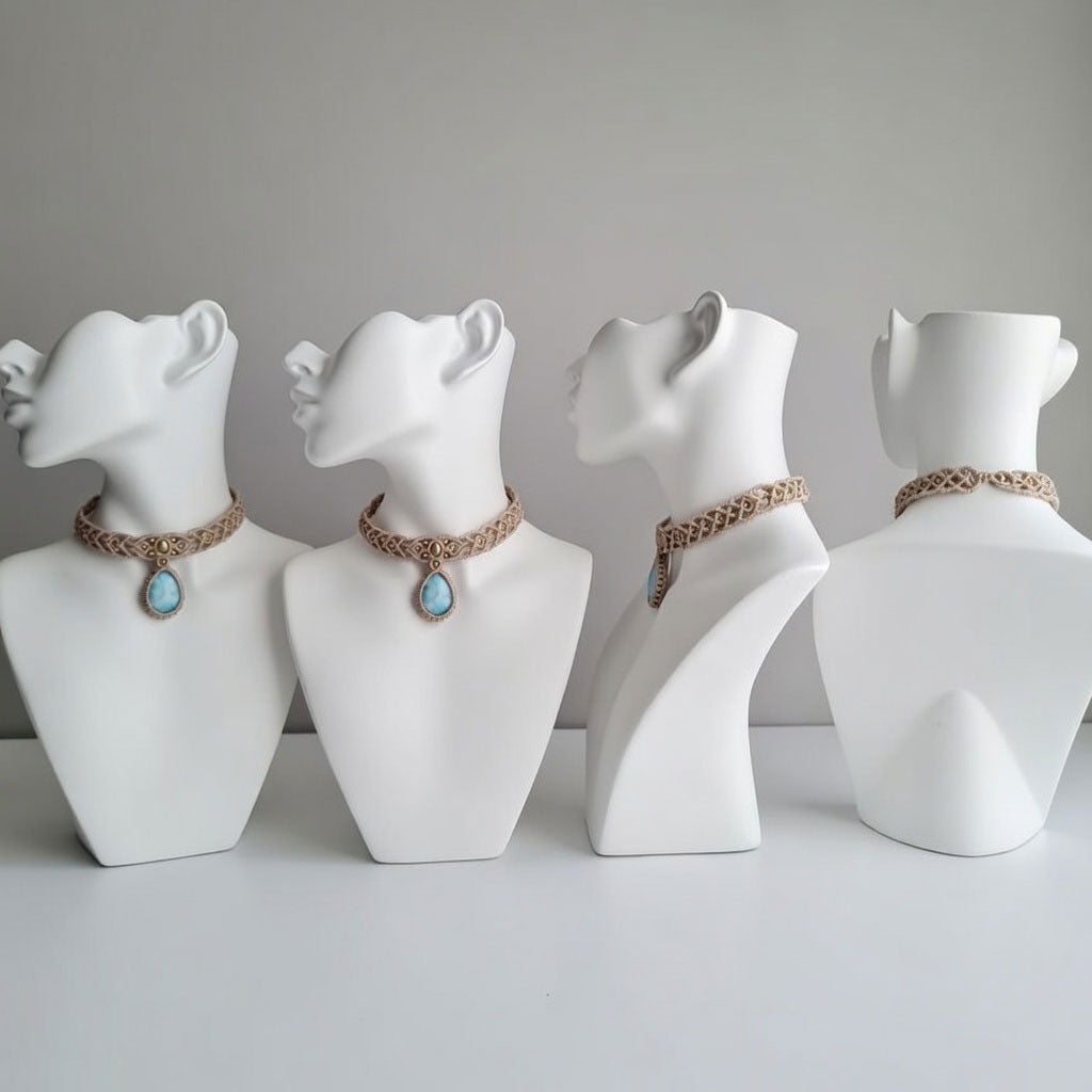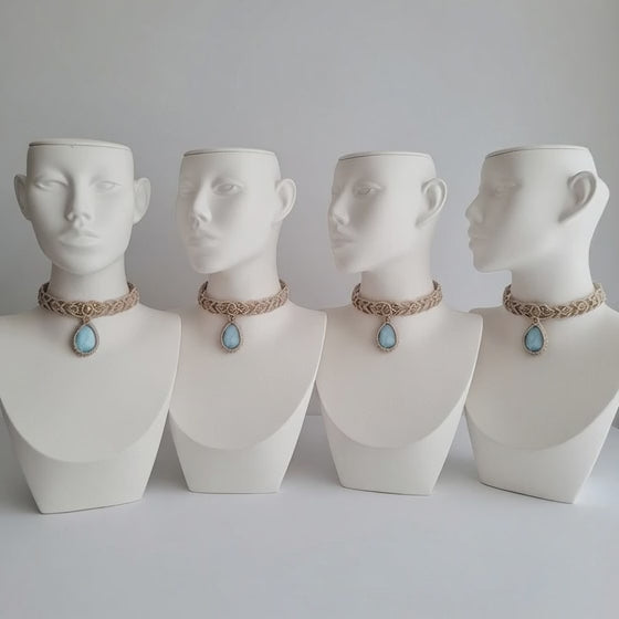 Hariom Creations introduces a delicate cream macramé choker featuring a rare Larimar teardrop stone. A soft, beach-inspired accessory for the modern bohemian.