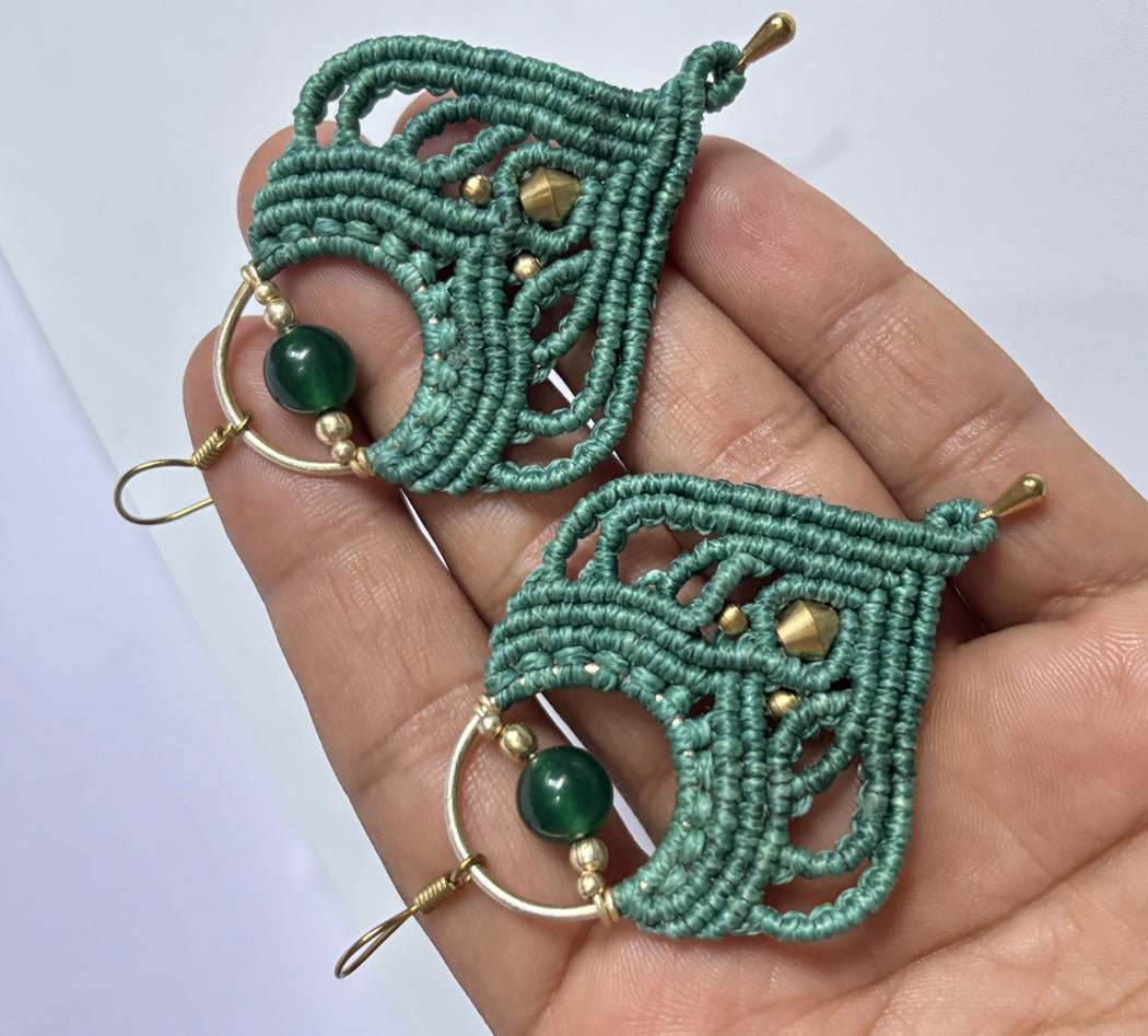 Macrame Dangle Pair Earrings Golden Color Brass Earrings Green Color Threads handcrafted with elegant macrame work, offering lightweight comfort and style.