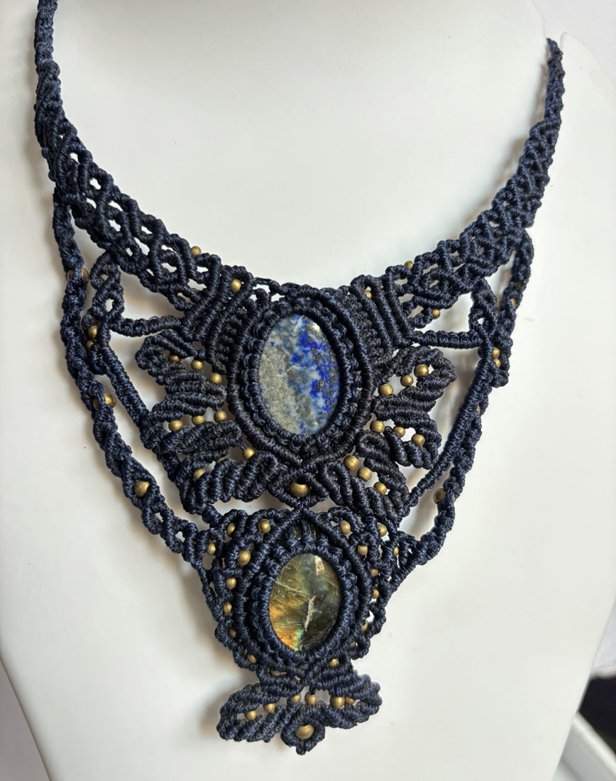 Macrame Necklace Oval Shape Labradorite or Tiger Eyes Double Gemstone Beads Green Color Threads handcrafted with dual gemstones and artisan macrame design.