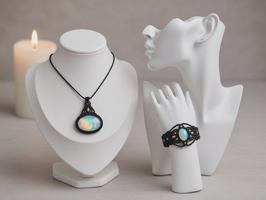 Hariom Creations offers a matching Moonstone macramé pendant and bracelet set. Hand-knotted with black cord to highlight the stone’s celestial glow