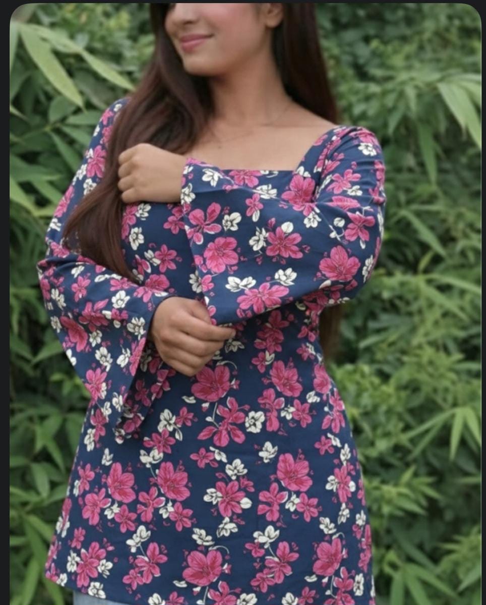 this chic navy blue top with bold pink floral accents. Designed with stylish bell sleeves and a square neck for a versatile day-to-night look.