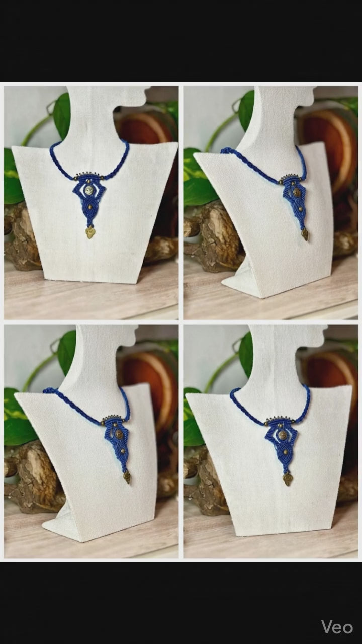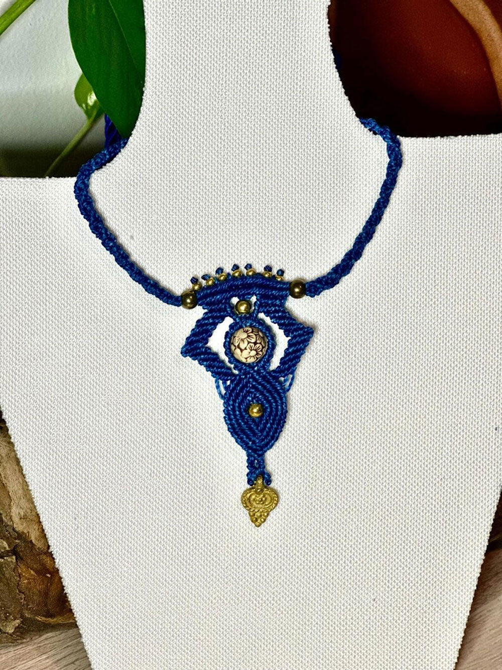 Hariom Creations showcases a royal blue macramé necklace featuring intricate geometric knotting and brass charms. Unique wearable art for jewelry lovers.
