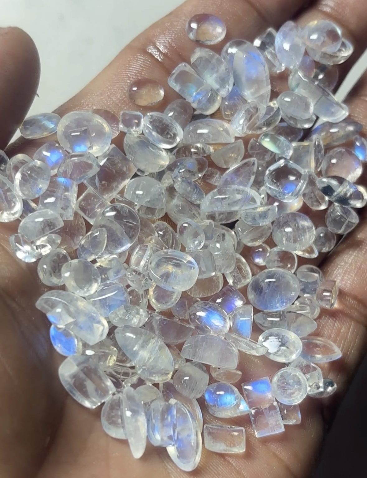 This White Rainbow Moonstone cut stone lot features freeform stones ranging from 10-25mm in size, perfect for creating unique, one-of-a-kind jewelry pieces. Known for its ethereal play of light, Moonstone reveals a beautiful rainbow shimmer that shifts as it catches the light, making each stone a captivating focal point. The freeform cut enhances the stone's organic, natural appeal, offering endless possibilities for custom designs. With its soothing energy and timeless beauty, these White Rainbow Moonstone stones are ideal for rings, earrings, pendants, or any piece that needs an extra touch of mystical elegance. Perfect for artisans and collectors alike.